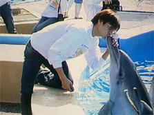 海 洋 公 園 的 經 驗 , 喚 起 了 他 六 年 前 拍 < 戰 神 傳 說 > 時 的 感 受 , 當 年 他 有 六 個 月 時 間 與 殺 人 鯨 海 威 日 夕 相 處 , 建 立 了 深 厚 的 感 情 。 所 以 他 在 水 池 與 一 些 海 豚 玩 耍 時 , 一 點 懼 怕 都 沒 有 , 他 更 即 場 與 海 豚 kiss , 羨 煞 一 班 專 程 捧 場 的 女 fans 。 華 仔 還 解 釋 道 , 與 海 豚 接 吻 是 與 女 孩 接 吻 不 同 的 , 因 為 海 豚 的 嘴 是 尖 , 而 女 孩 的 嘴 是 平 的 . 引 來 現 一 陣 哄 笑 。